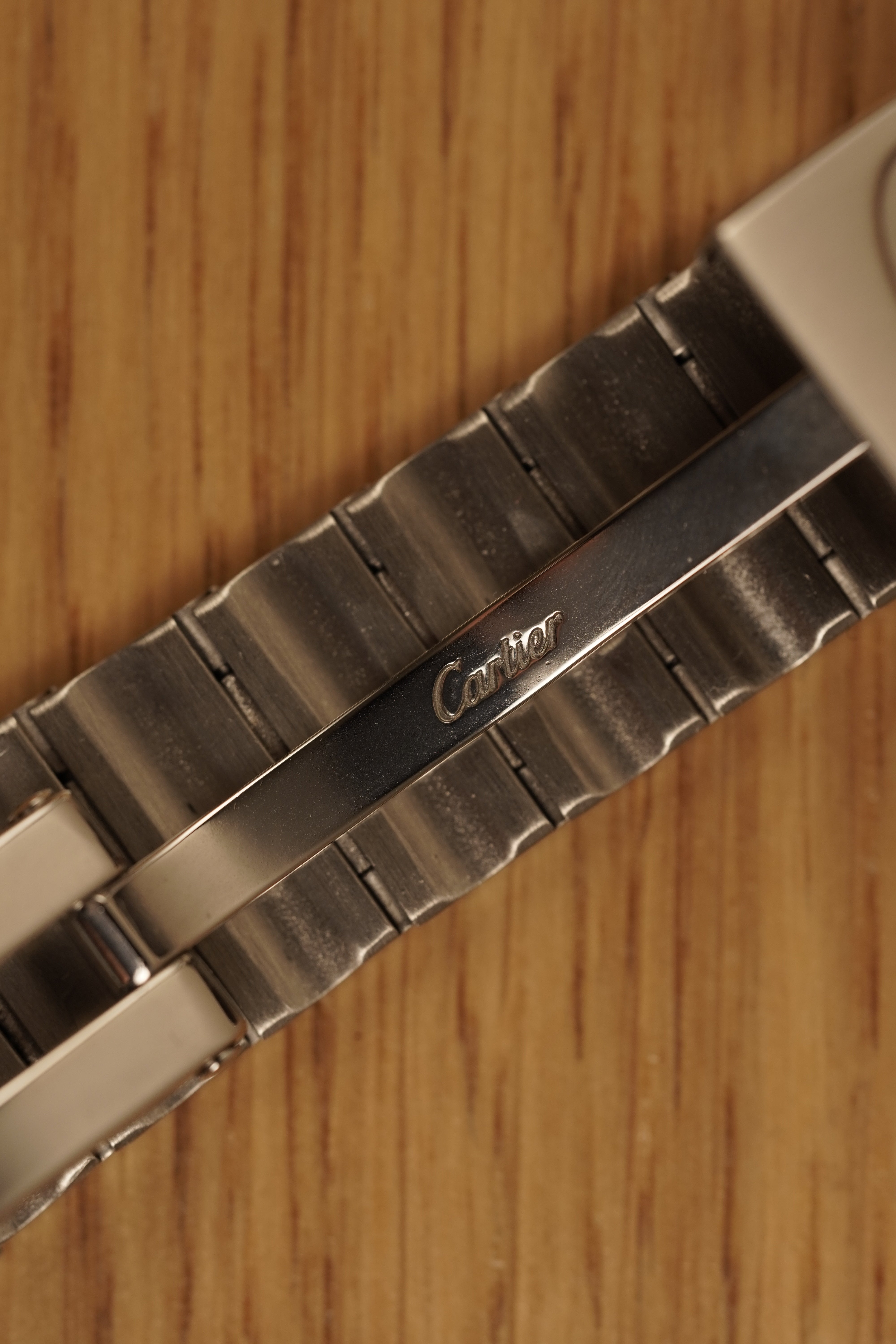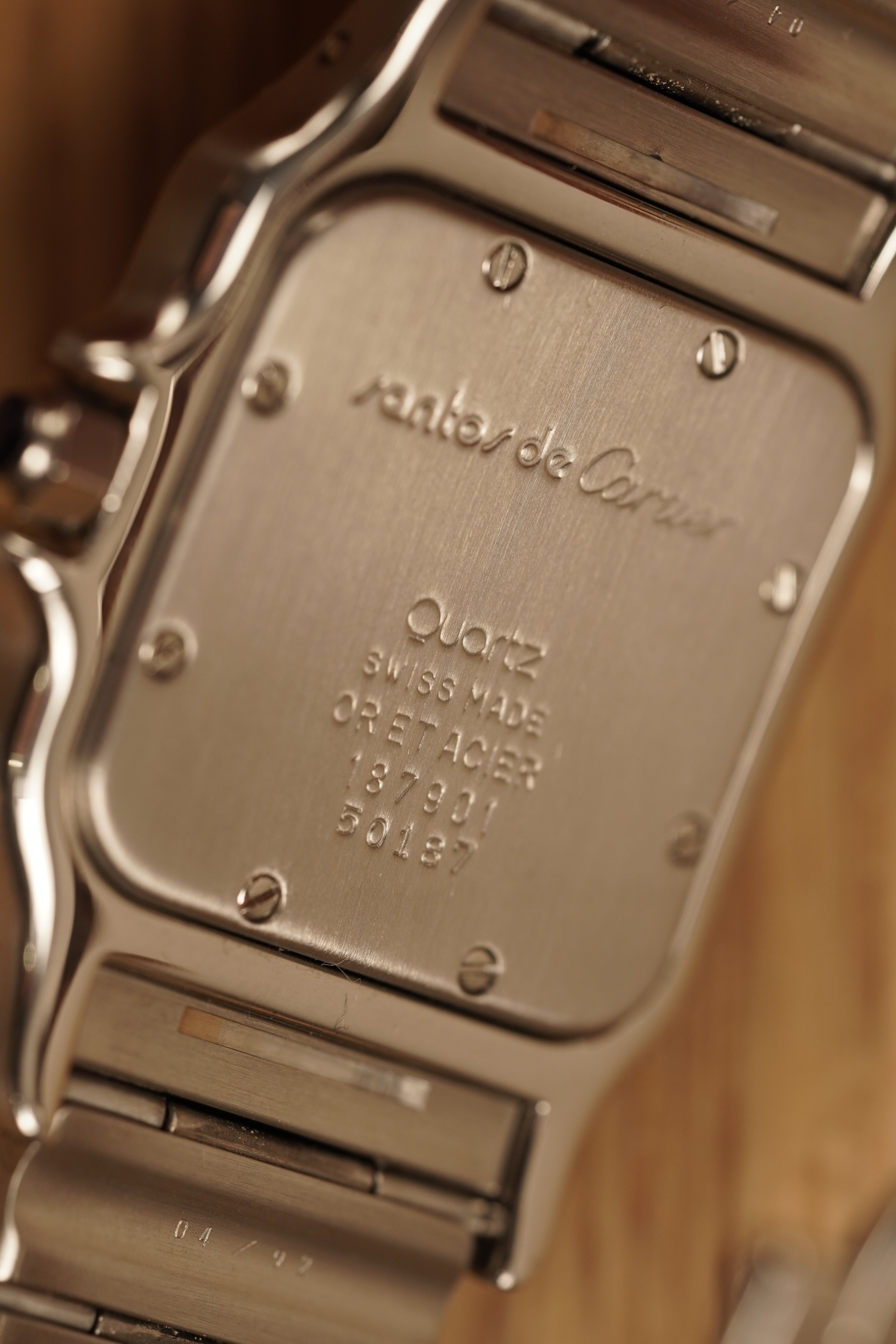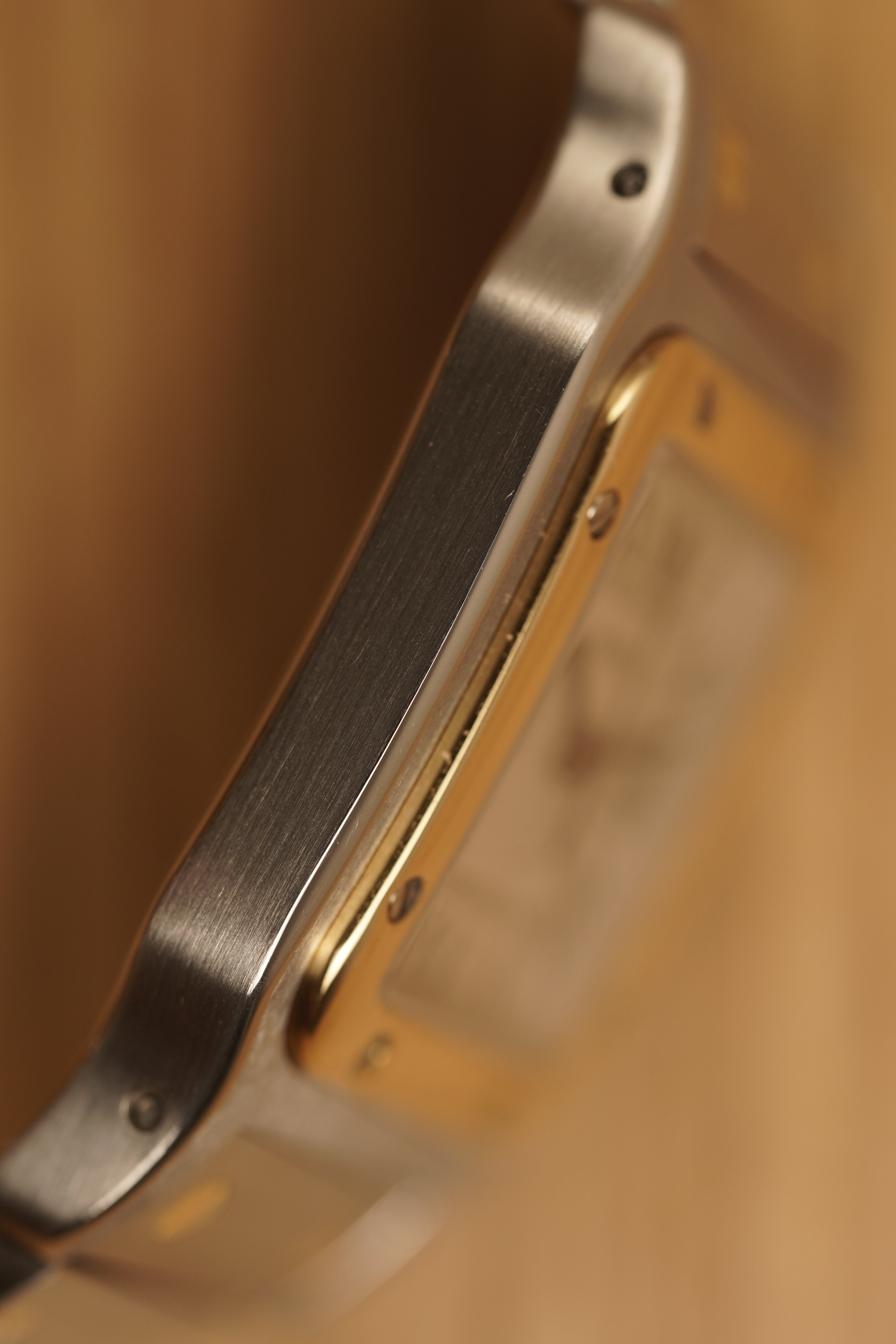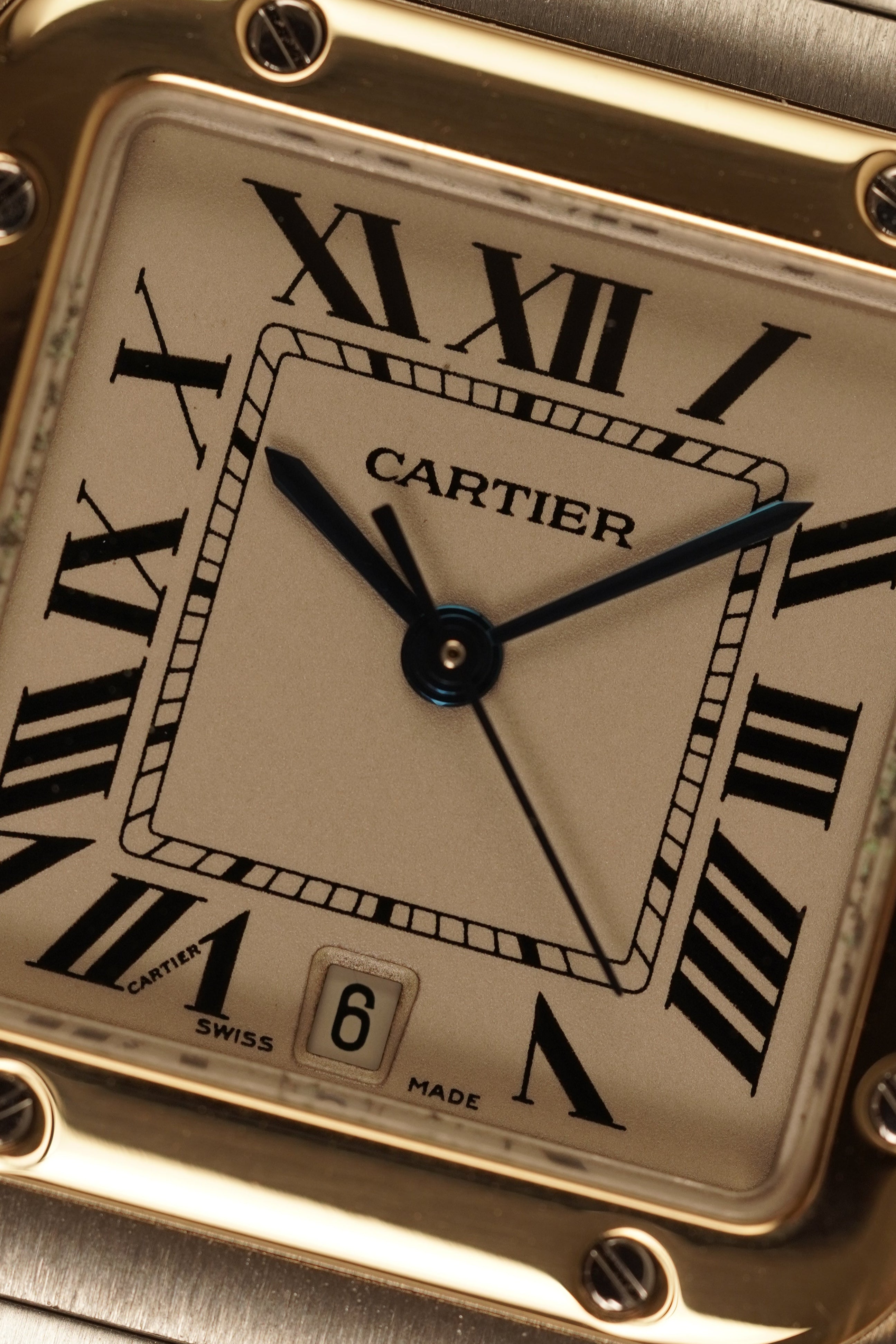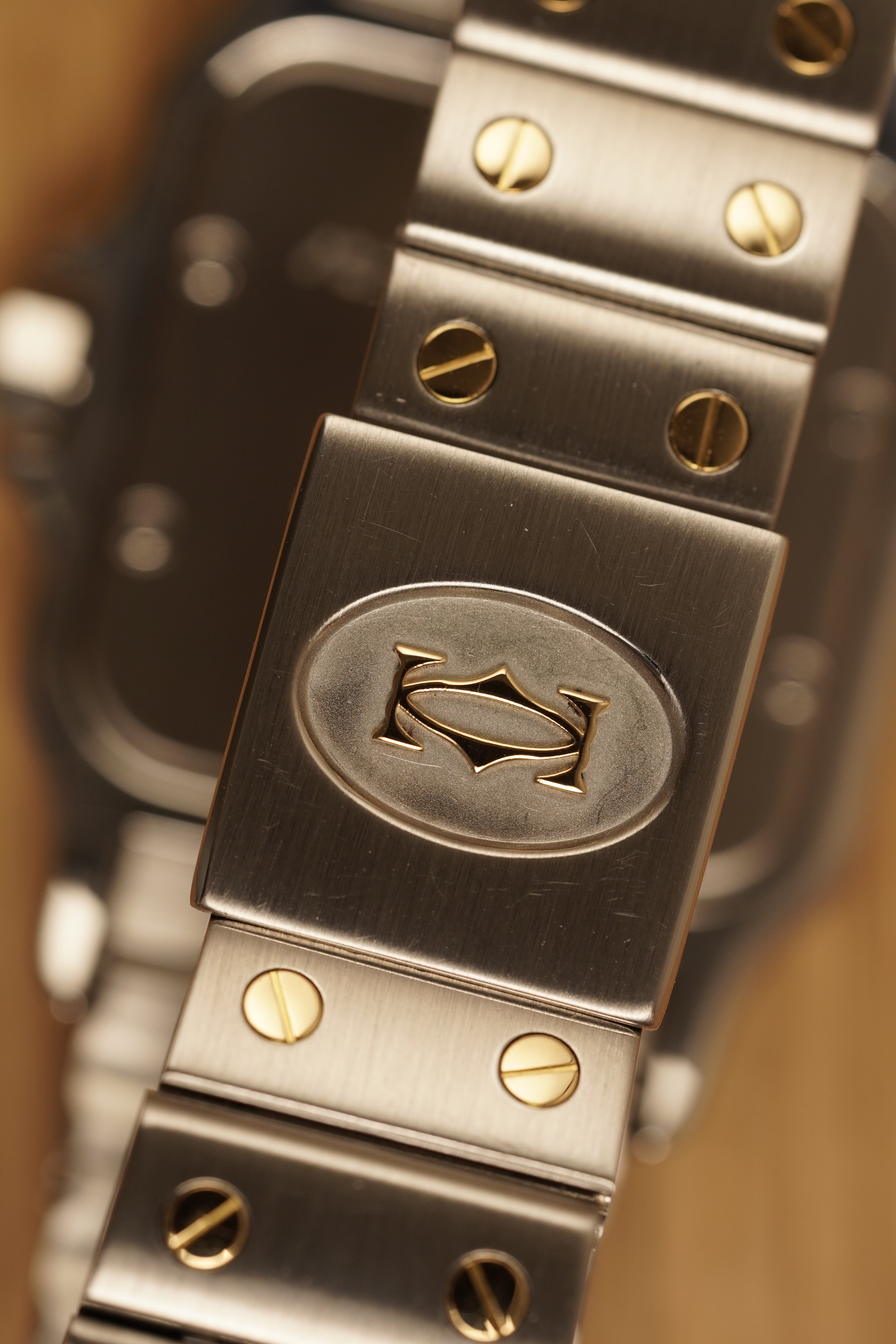 La Cartier Santos or/acier référence 187901 appartient à la ligne Santos Galbée, évolution lancée dans les années 1980 du modèle créé par Louis Cartier en 1904 pour l’aviateur Alberto Santos-Dumont. Cette version bicolore associe l’acier et l’or jaune, avec un boîtier de 29 × 41 mm. Animée par un mouvement à quartz, elle arbore un cadran clair avec chiffres romains noirs et des aiguilles bleuies. Son bracelet intégré, caractérisé par ses vis apparentes, est équipé d’un fermoir signé du double C de Cartier, gage d’authenticité et de finition soignée. Cette référence incarne une interprétation élégante et intemporelle de la Santos, devenue l’un des modèles emblématiques de Cartier.