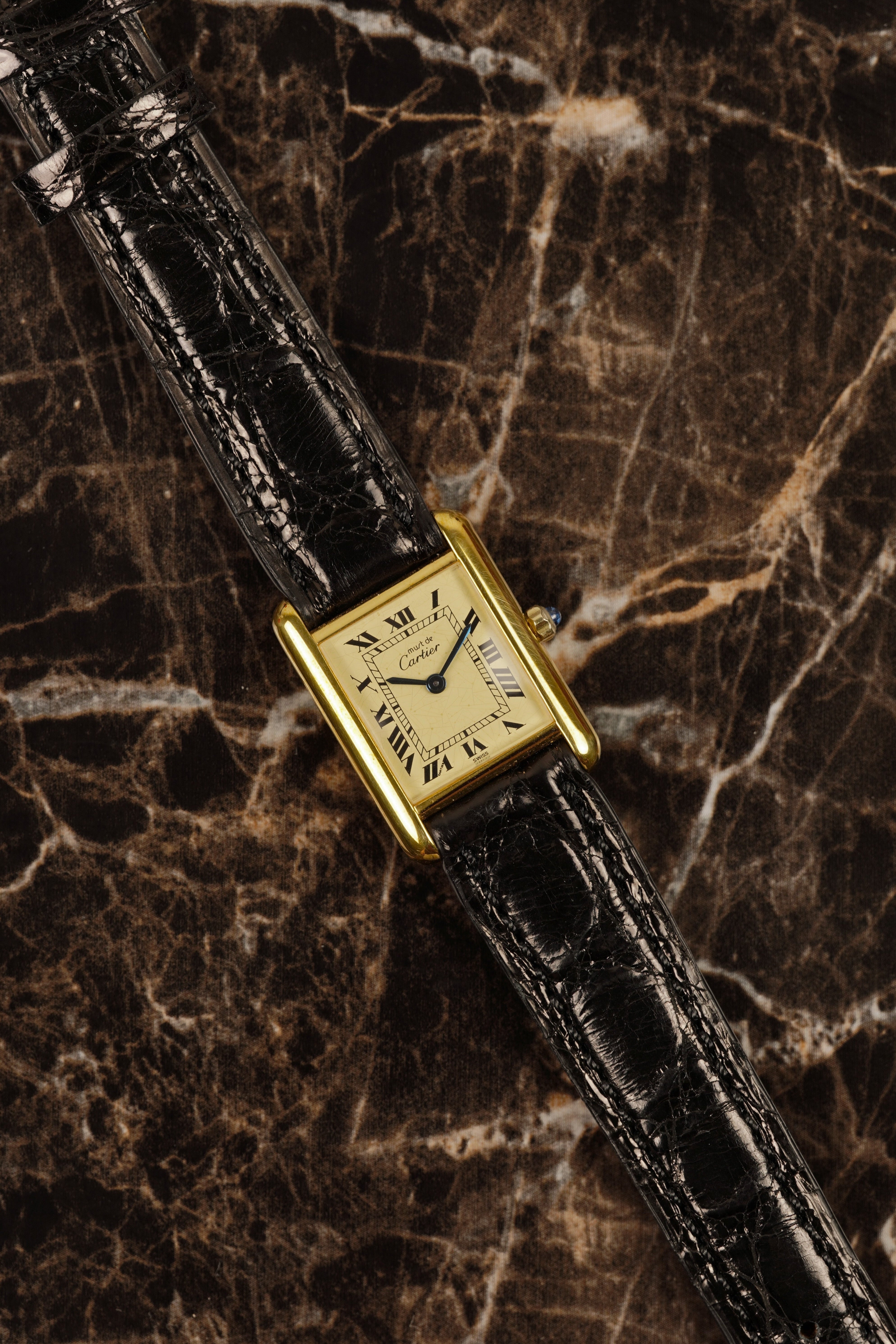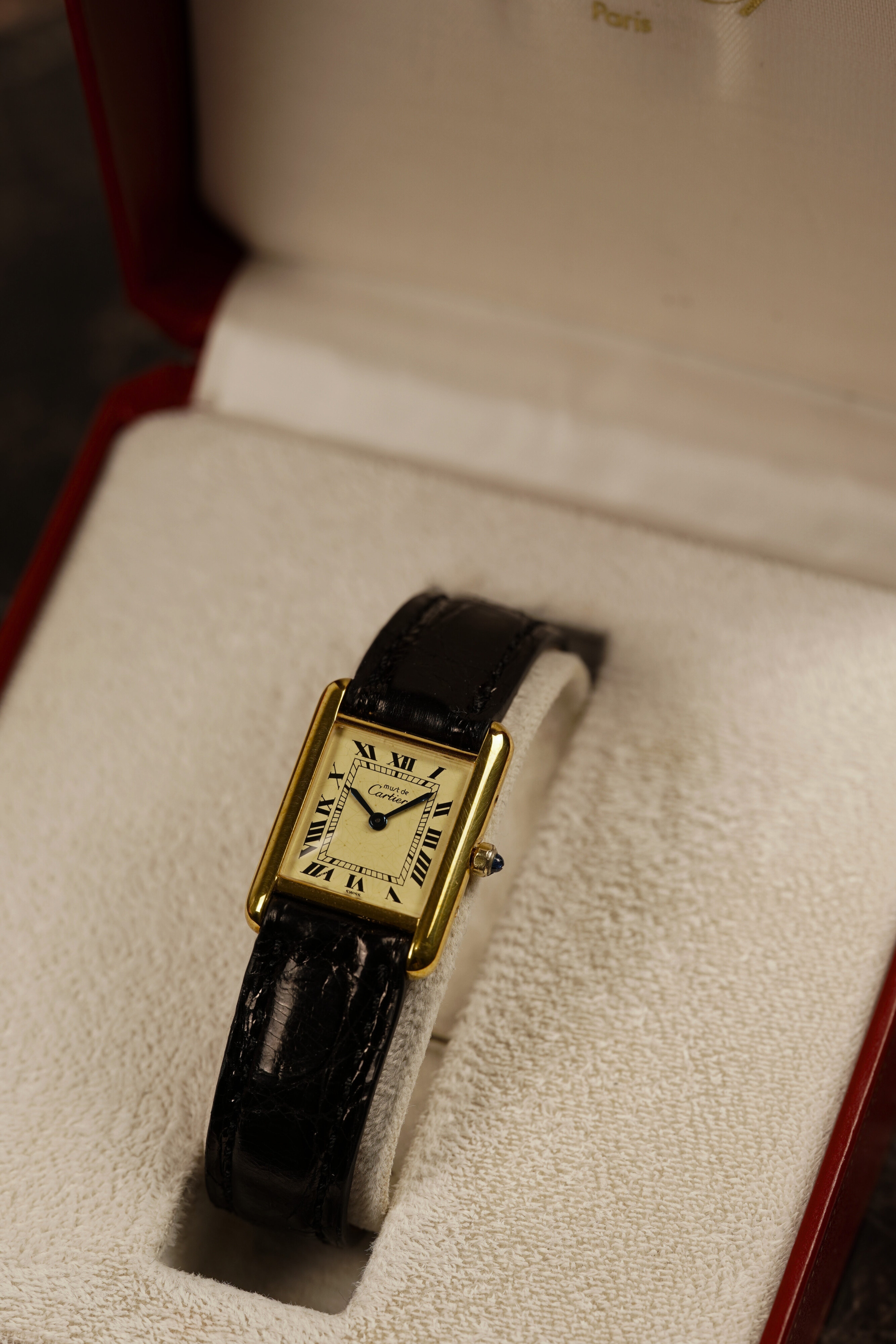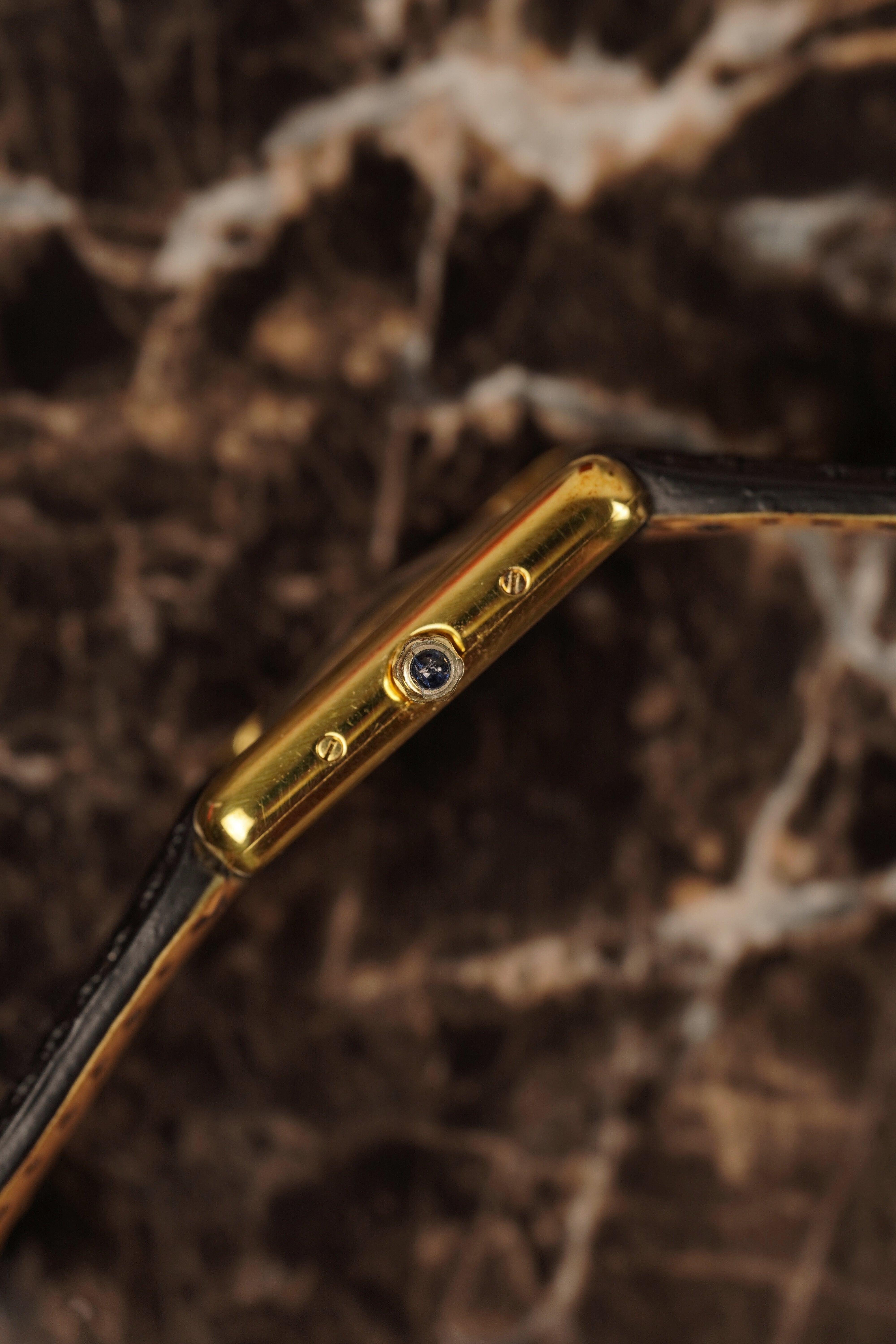 La Cartier Must de Tank référence 366001, lancée dans les années 1980, reprend le design iconique de la Tank créée en 1917 par Louis Cartier. Ce modèle se distingue par son boîtier rectangulaire plaqué or, son cadran clair patiné aux chiffres romains classiques et ses aiguilles bleuies. Animée par un mouvement à quartz fiable et précis, ce garde temps est l'exemple parfait de l’esprit raffiné de la collection Must.